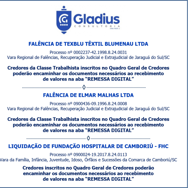 A GLADIUS CONSULTORIA E GESTÃO EMPRESARIAL S/S LTDA é empresa especializada com competente registro no órgão de fiscalização da profissão de administrador de empresas - CRA/SC 1025-J.